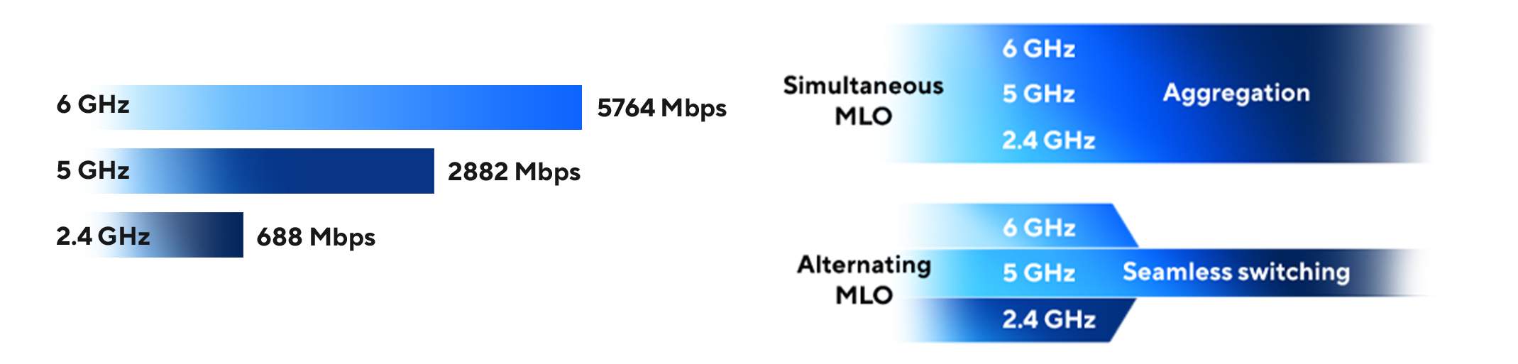 Multi-Link Operation (MLO) allows simultaneous connections across multiple bands, resulting in more stable connections, lower latency, and higher throughput - ideal for gaming, 8K streaming, and cloud-based work.