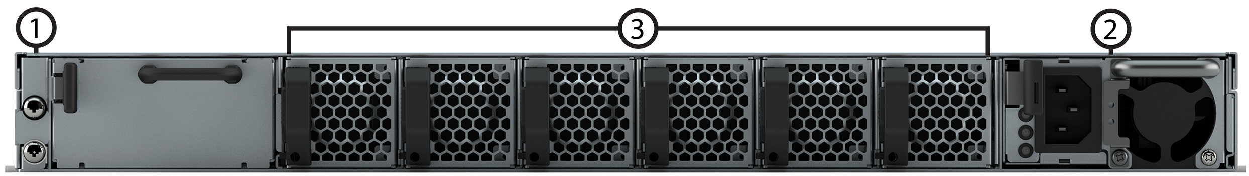 | 1. | 10GBase-T RJ-45 1/10 Gb/s ports | 2. | QSFP28 40/100 Gb/s ports | 3. | OOB management port 10/100/1000 Mb/s |