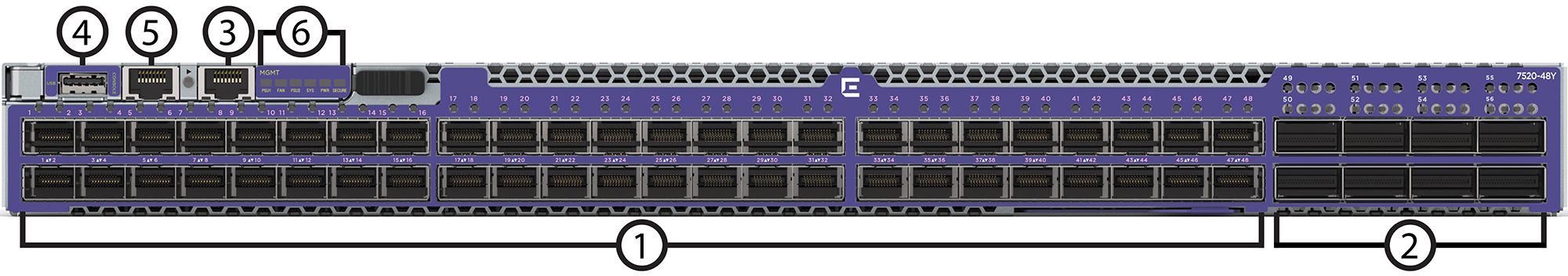 | 4. | USB Type-A port | 5. | RJ-45 console port | 6. | System LEDs |