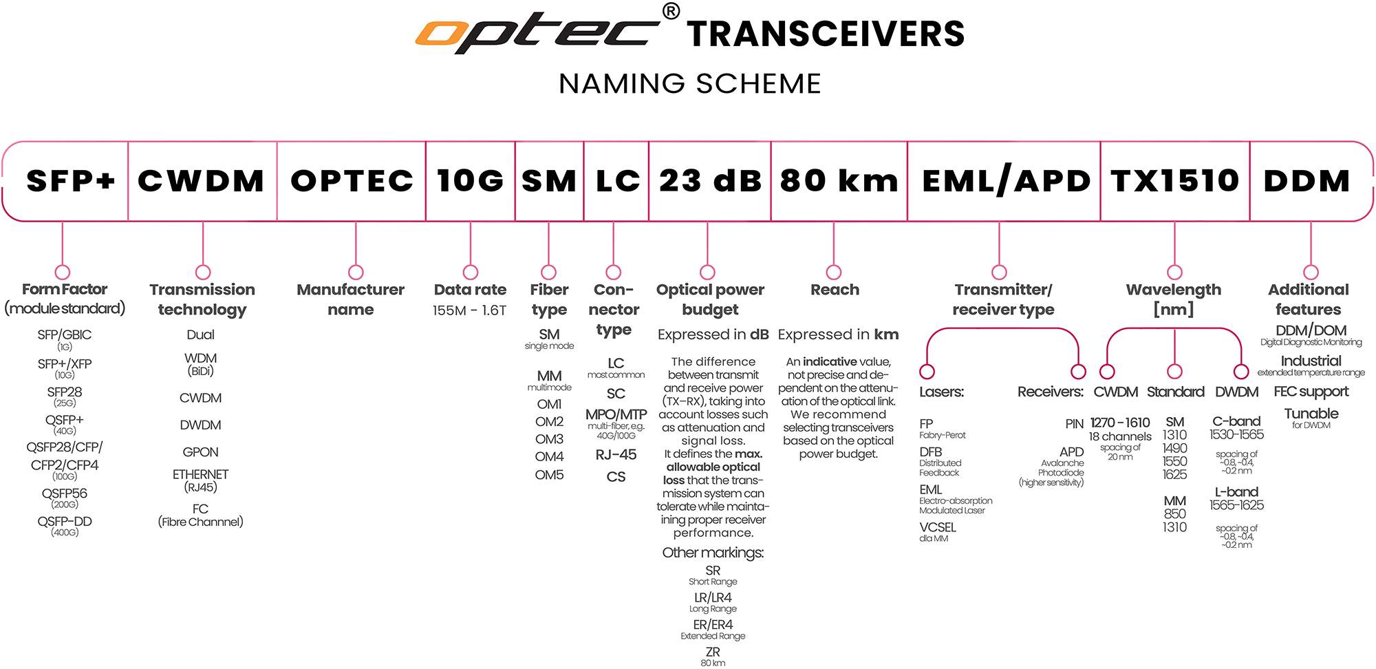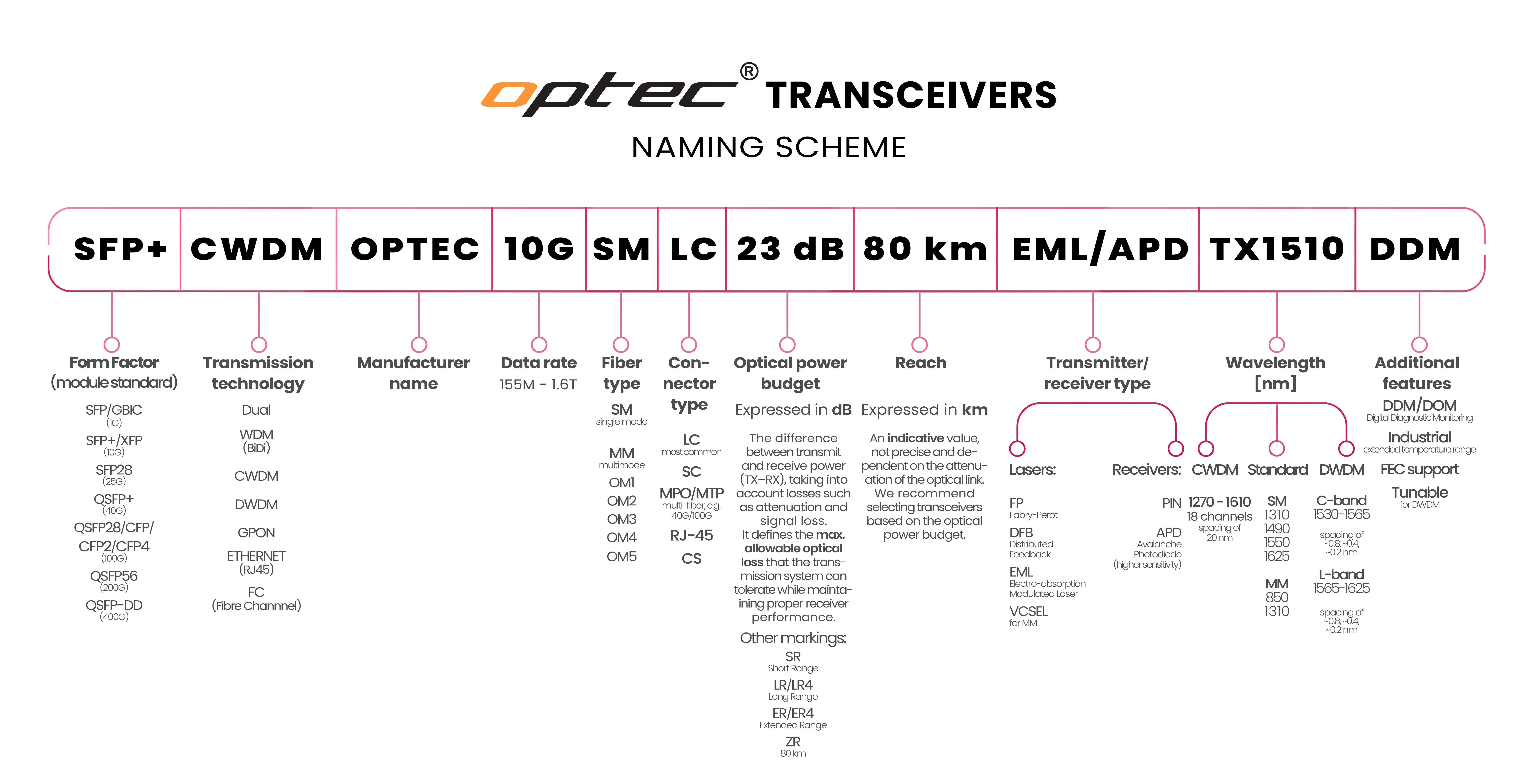 The SFP+ DWDM OPTEC 10G SM LC 23 dB 80 km EML/APD DDM module operates in the wavelength range of 1528.77-1563.86 nm (ITU-T channels 17-61). This allows selection of a specific channel from the DWDM grid, enabling the construction of very high-capacity transmission systems using MUX/DEMUX multiplexers.