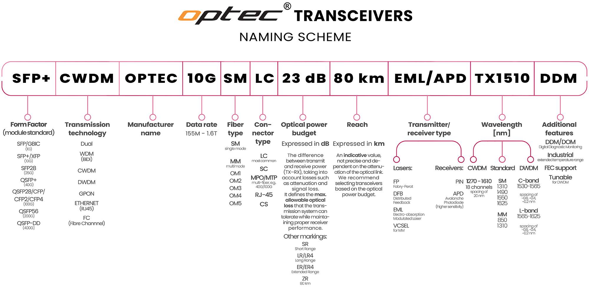 | Optical power budget | 23 dB, ZR - Extended Range |