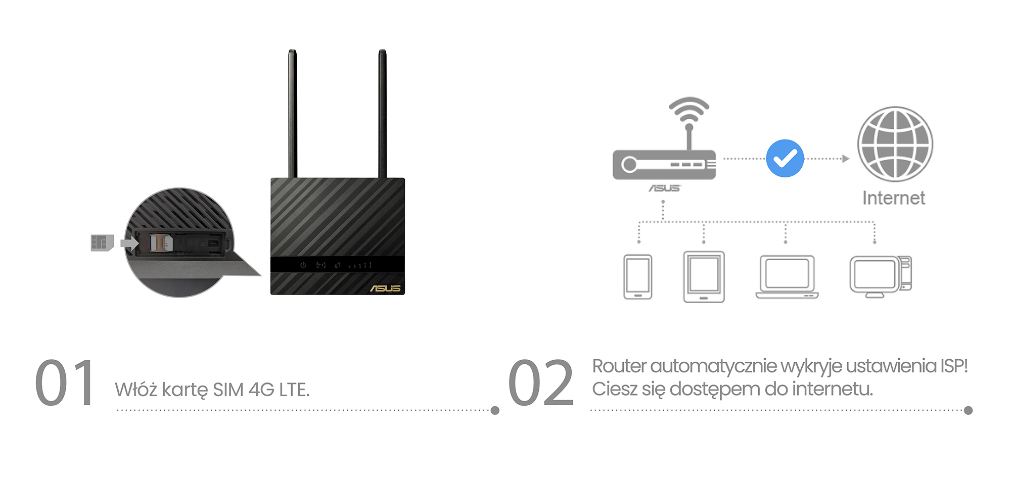 ASUS 4G-N16 to funkcjonalny router LTE z wbudowanym modemem 4G, który zapewnia szybki i stabilny dostęp do internetu bez konieczności korzystania z tradycyjnych łączy kablowych. Wystarczy włożyć kartę SIM, aby w kilka chwil uruchomić bezprzewodową sieć internetową w domu, biurze lub w lokalizacjach o ograniczonej infrastrukturze przewodowej.